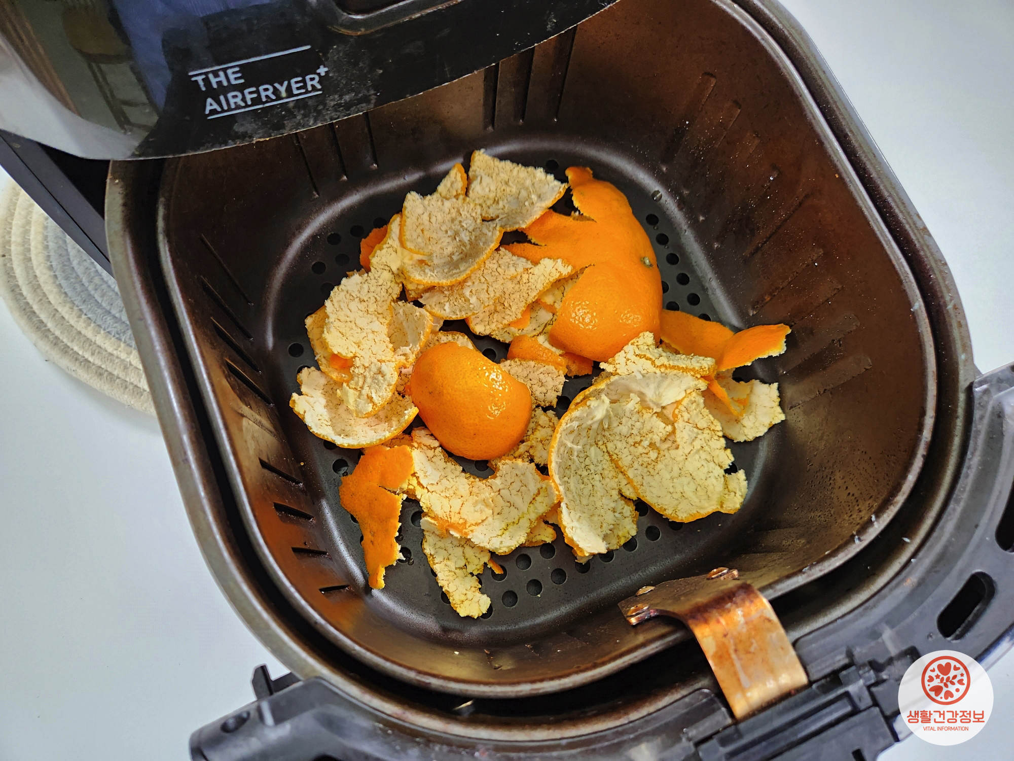 에어프라이어 바스켓에 귤껍질을 몽땅 넣어요.