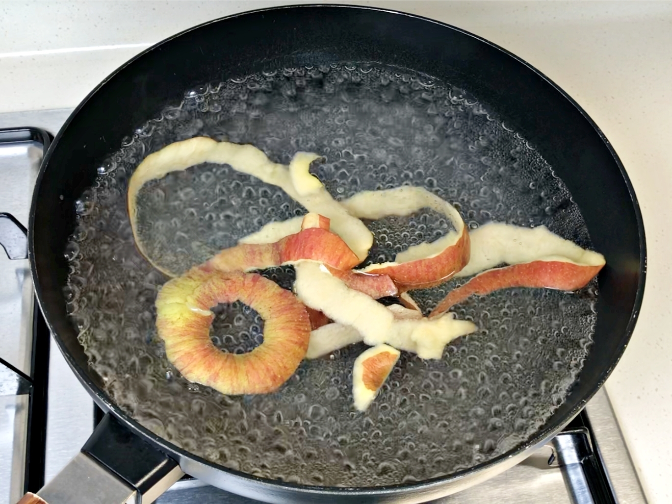 물이 팔팔 끓으면 사과껍질을 넣고 1~2분 더 끓여주세요.