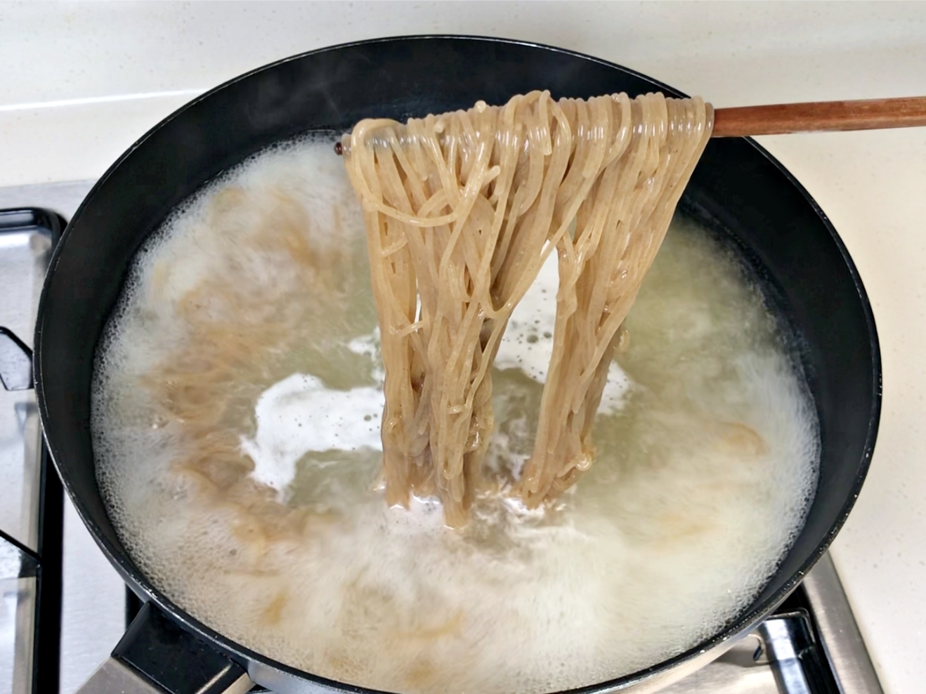 냉면 면을 넣어 삶아주세요.