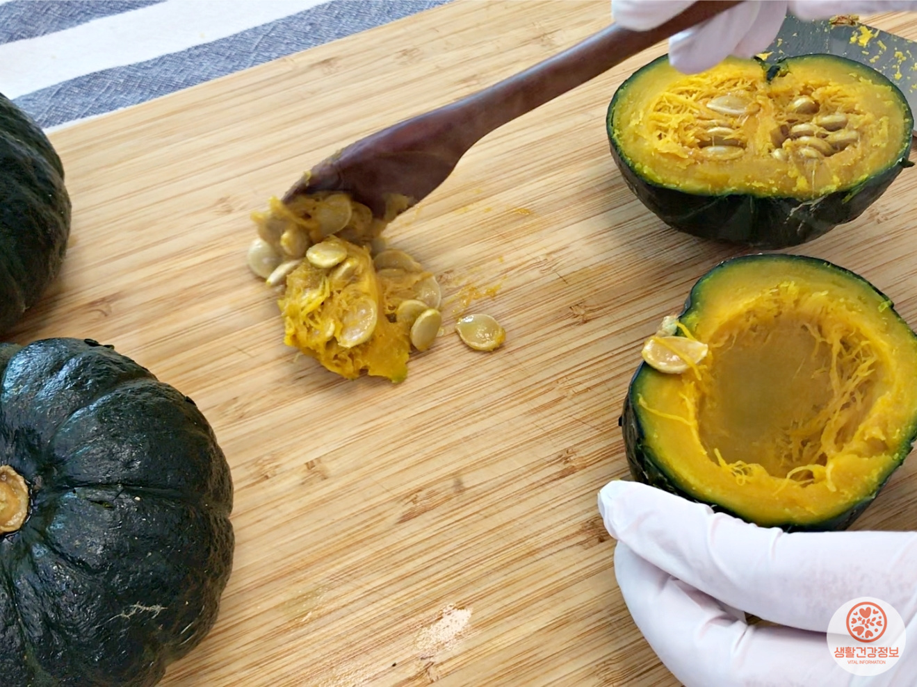 부드럽게 익은 미니밤호박을 반으로 잘라서 속을 파내고,