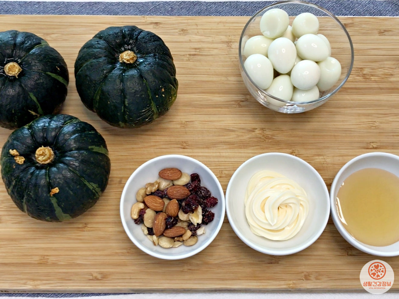 재료는 미니밤호박, 메추리알, 견과류, 마요네즈, 꿀 준비했어요.