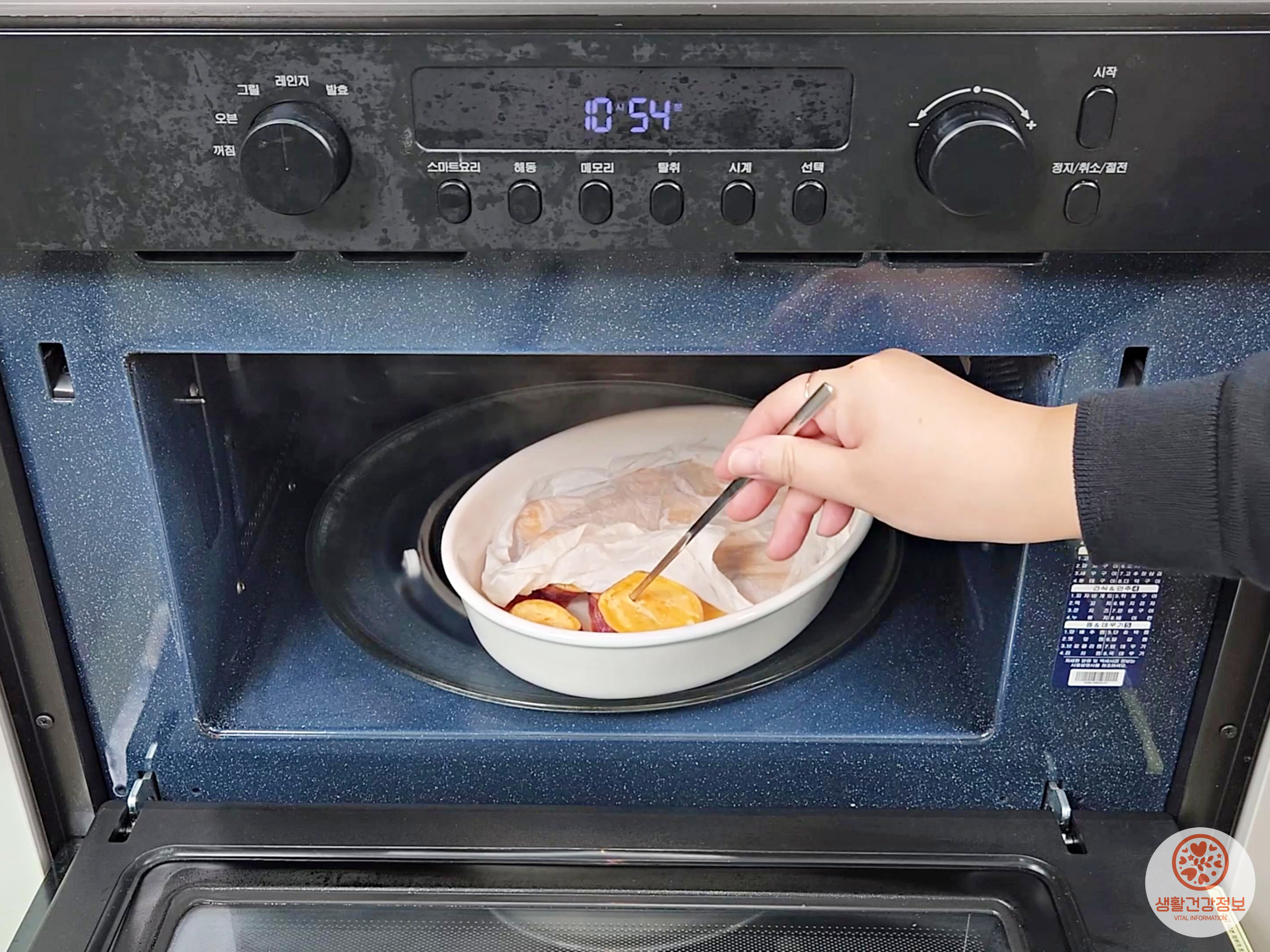 물에 흠뻑 적신 키친타월 덮어서 전자레인지로 데워주세요.