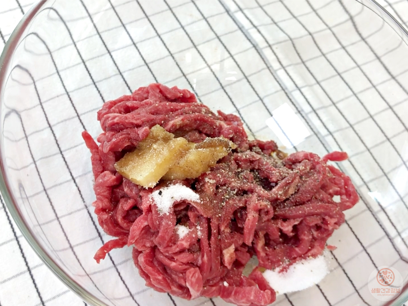 고기에 다진마늘1, 간장3, 설탕1, 후추 톡톡 뿌려서