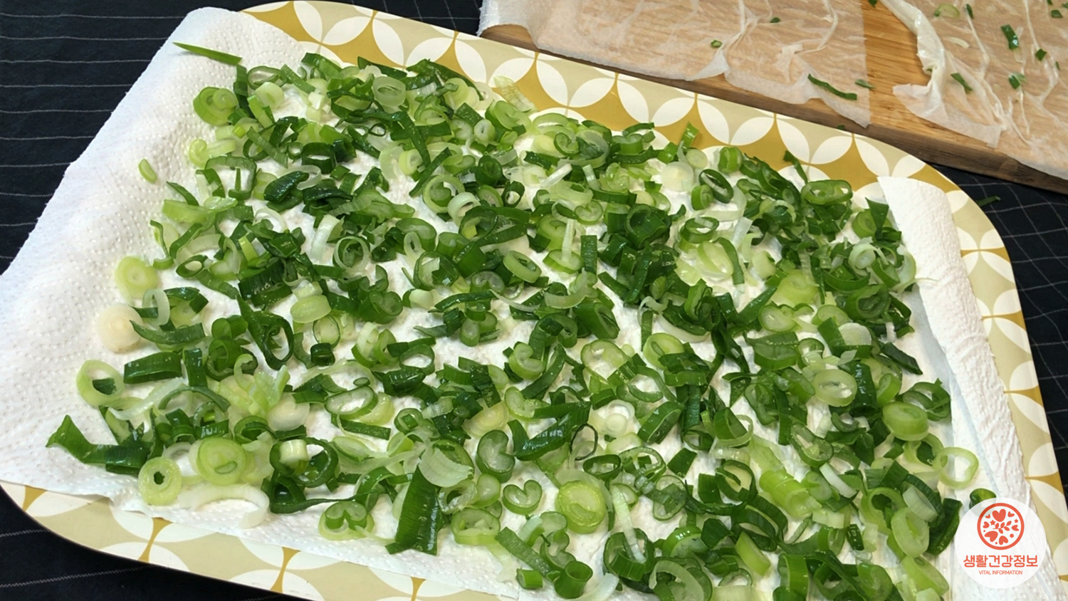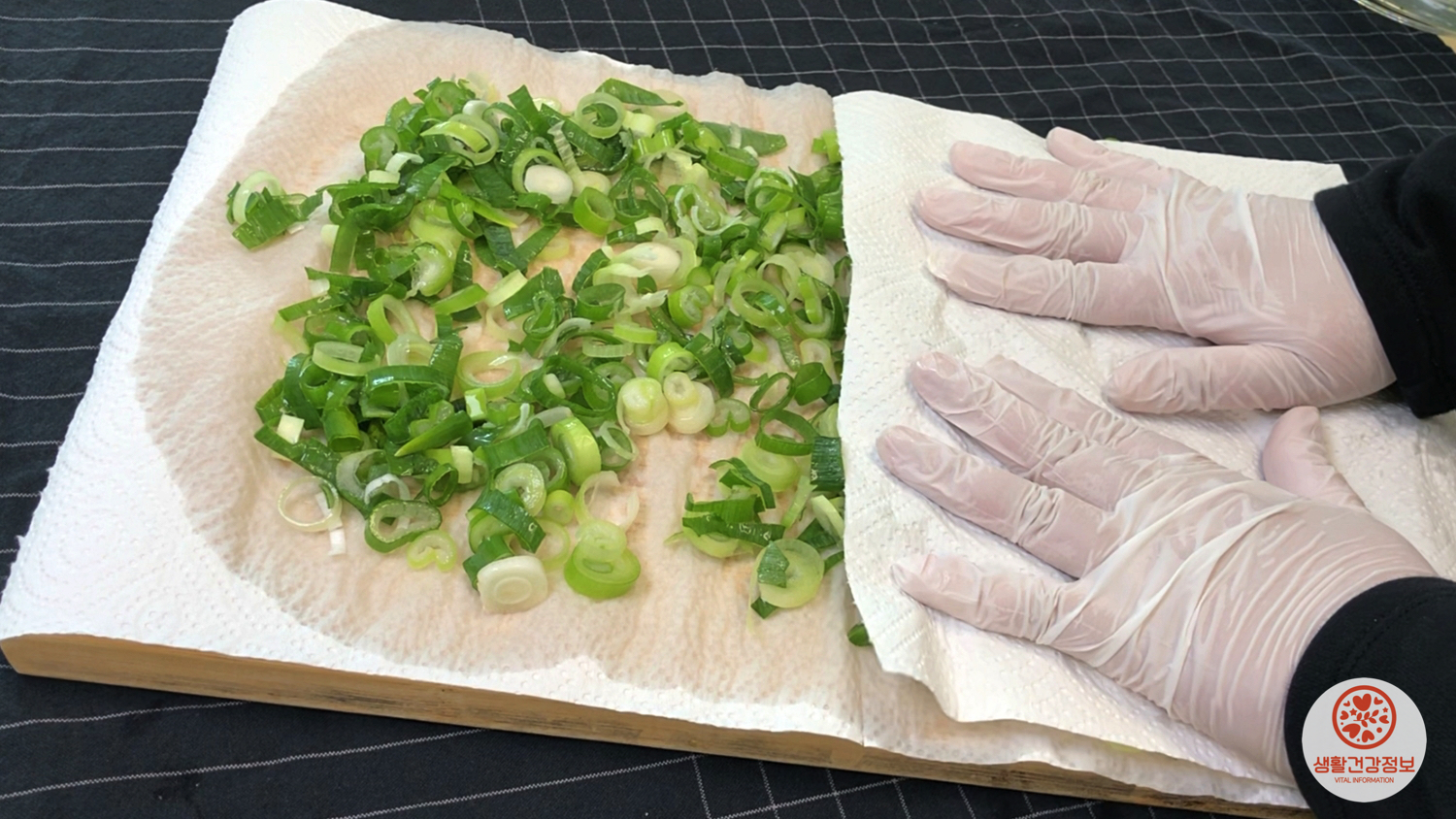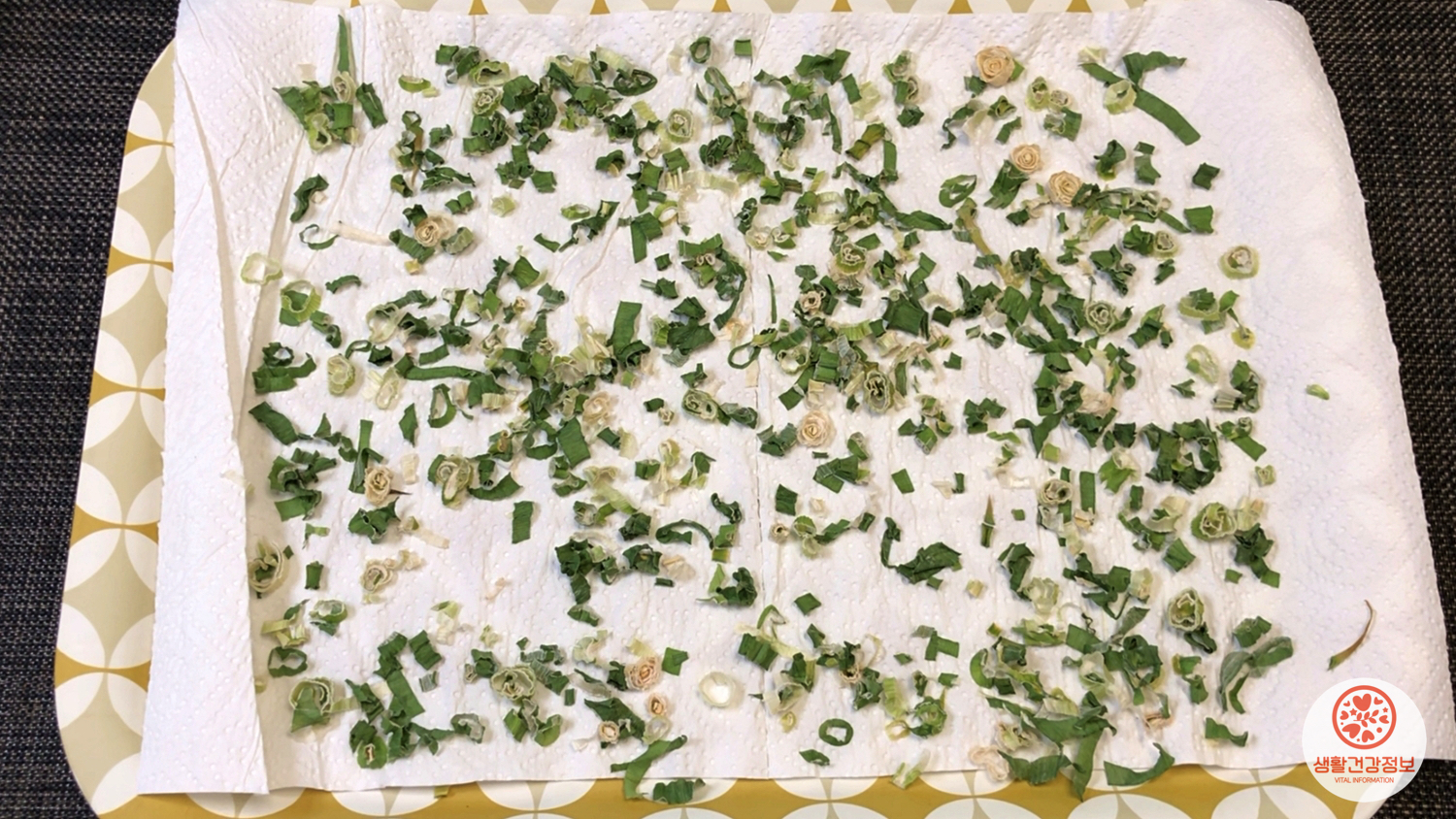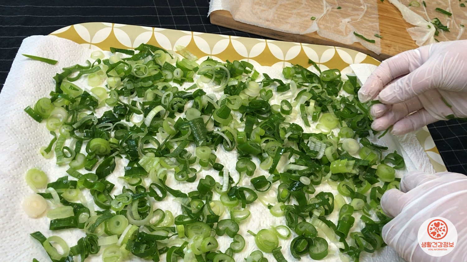 다시 뽀송뽀송한 키친타월 위에 대파를 올려주세요.