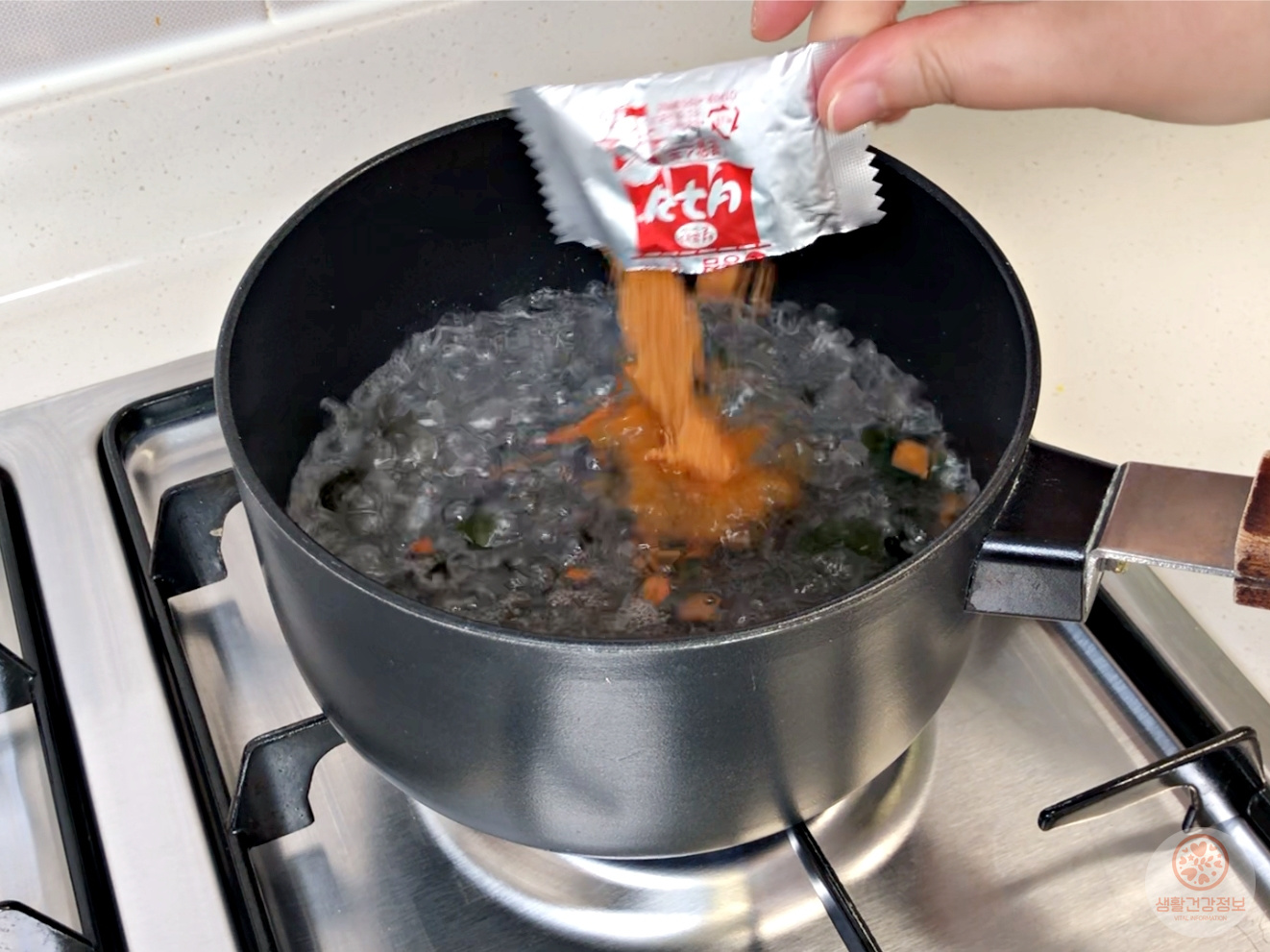 물이 끓으면 건더기스프와 분말스프를 넣고요.