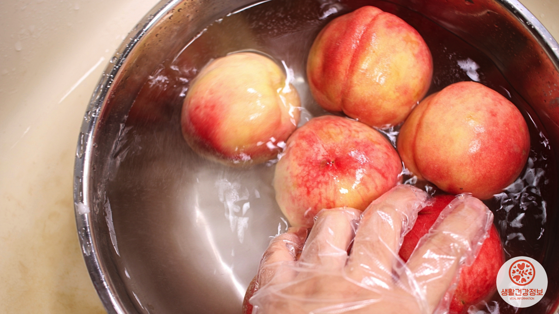 세척이 끝나면 복숭아 껍질을 벗겨주세요.