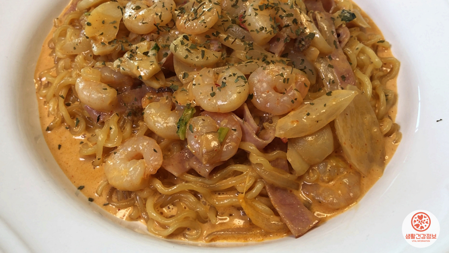 ★ 매콤한 라면, 우유, 새우, 마늘, 양파, 햄, 치즈
