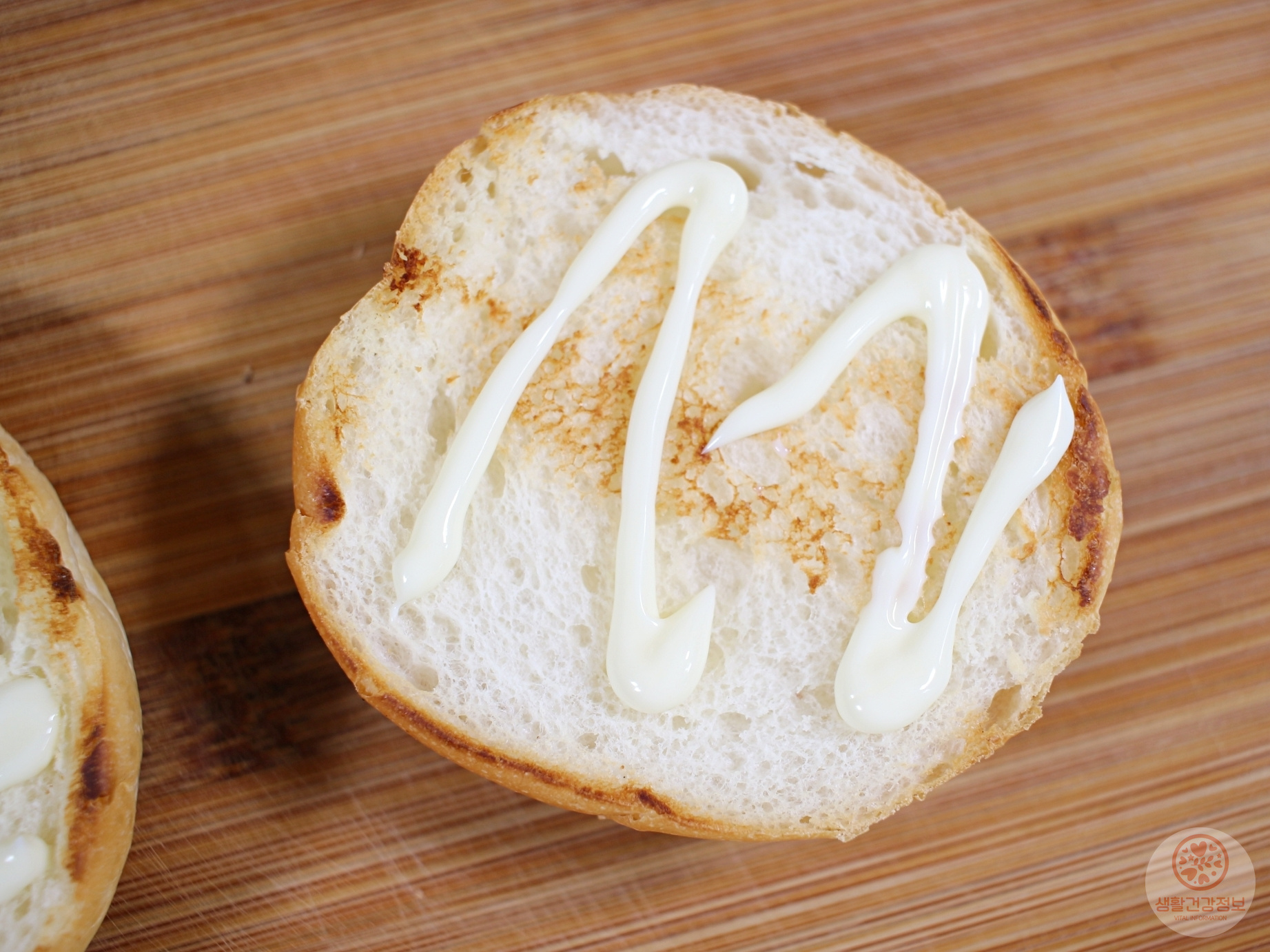 모닝빵에 마요네즈를 살짝 발랐어요.