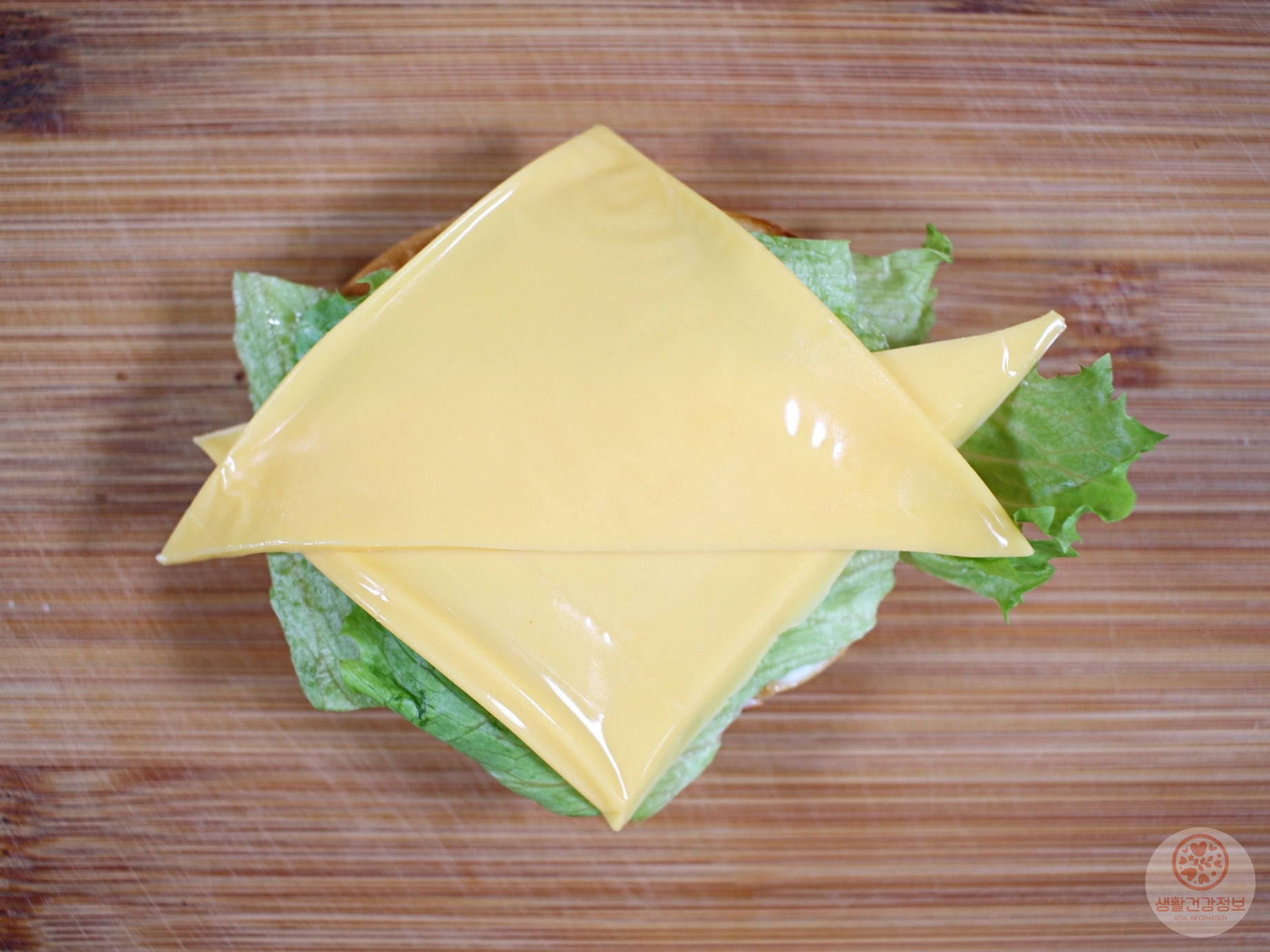 모닝빵 사이즈에 맞춰서 양상추, 슬라이스치즈 올려주시고요.