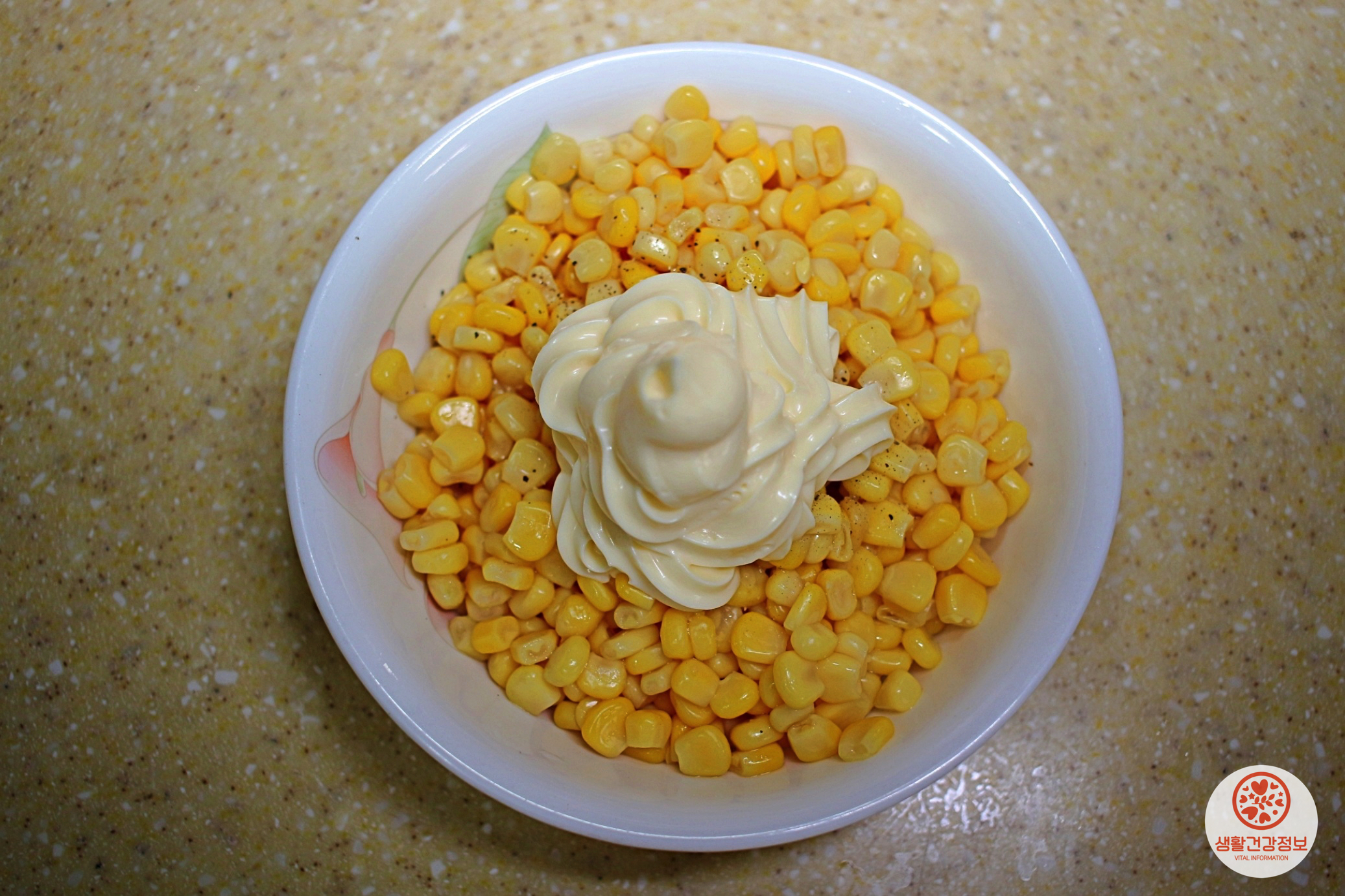 미리 만들어놓은 콘샐러드를 올려주세요.