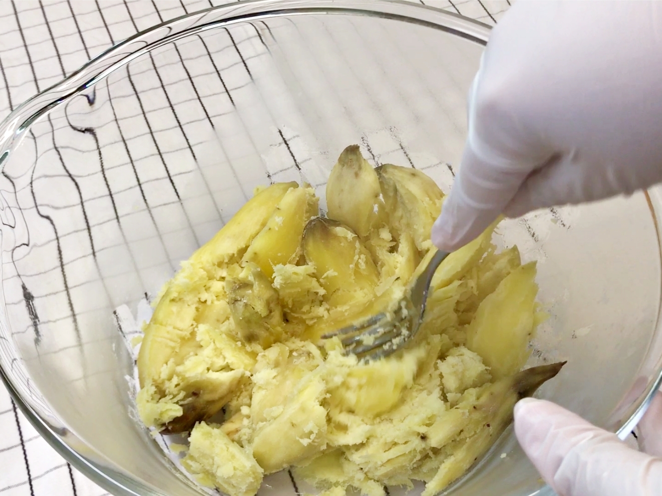 따뜻할 때 포크로 곱게 으깨주세요.