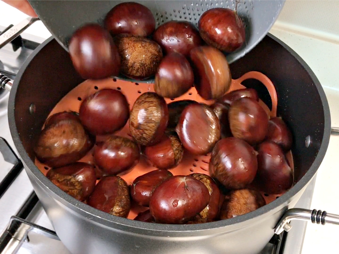 이 상태에서 바로 찬물에 밤을 헹궈주세요.