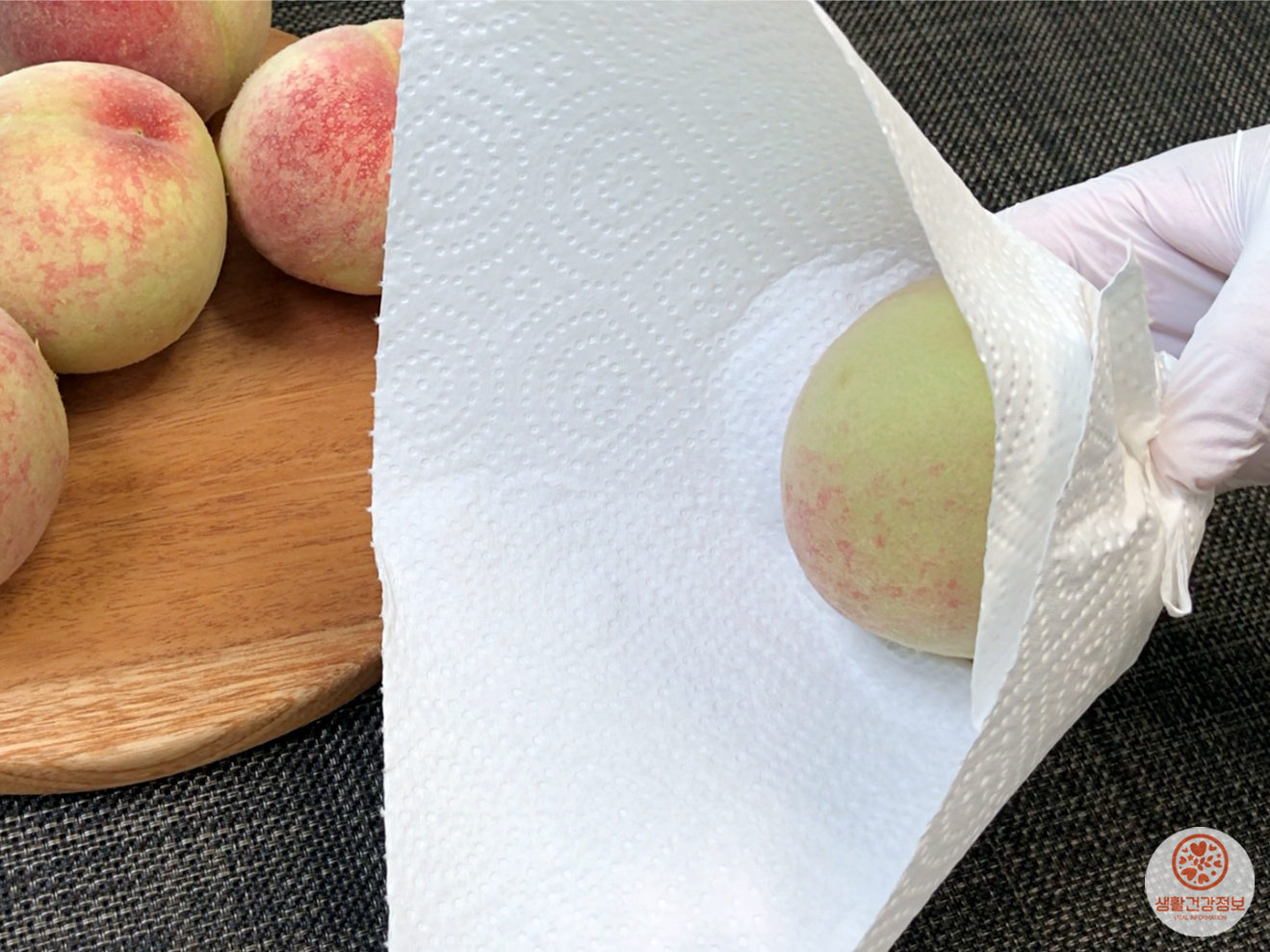 키친타월로 복숭아를 하나씩 감싸주세요.