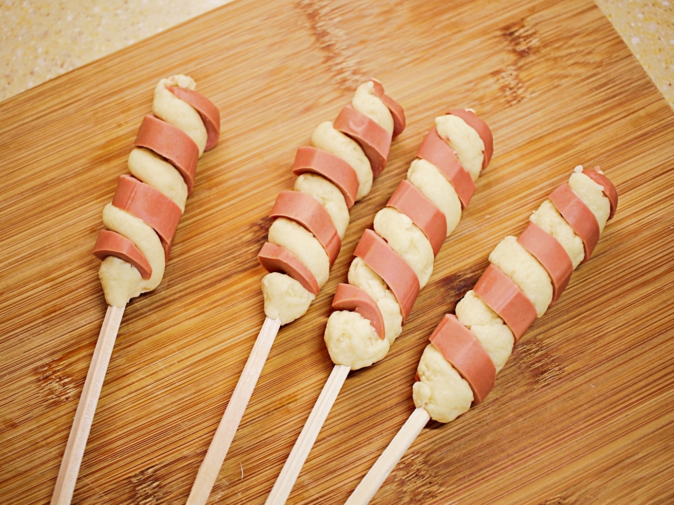소시지 사이에 반죽을 끼워넣으면 준비 끝~!