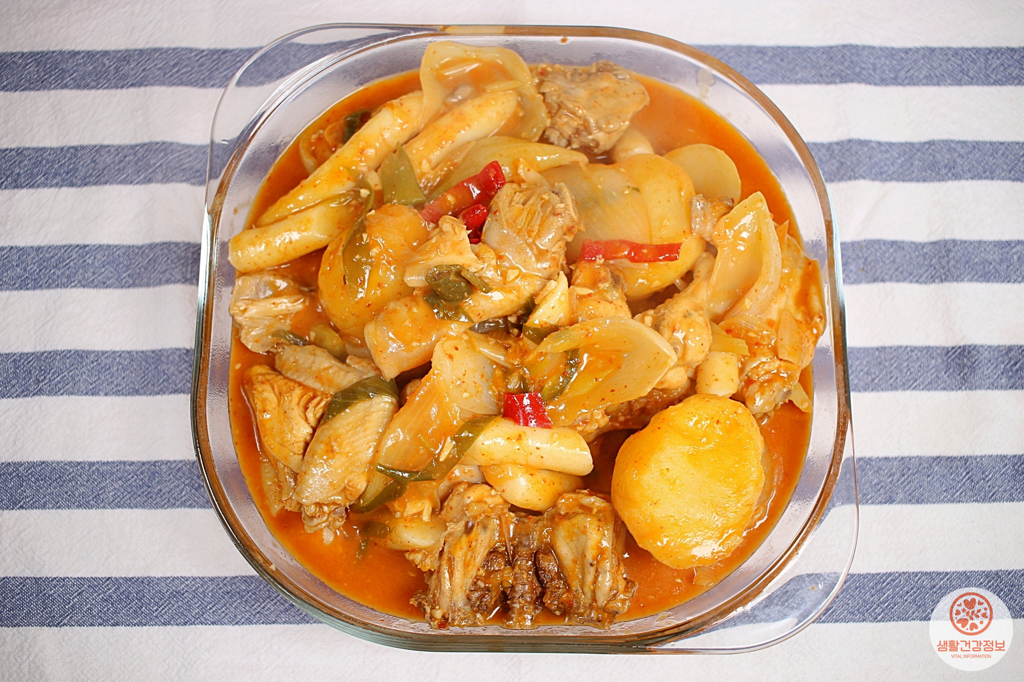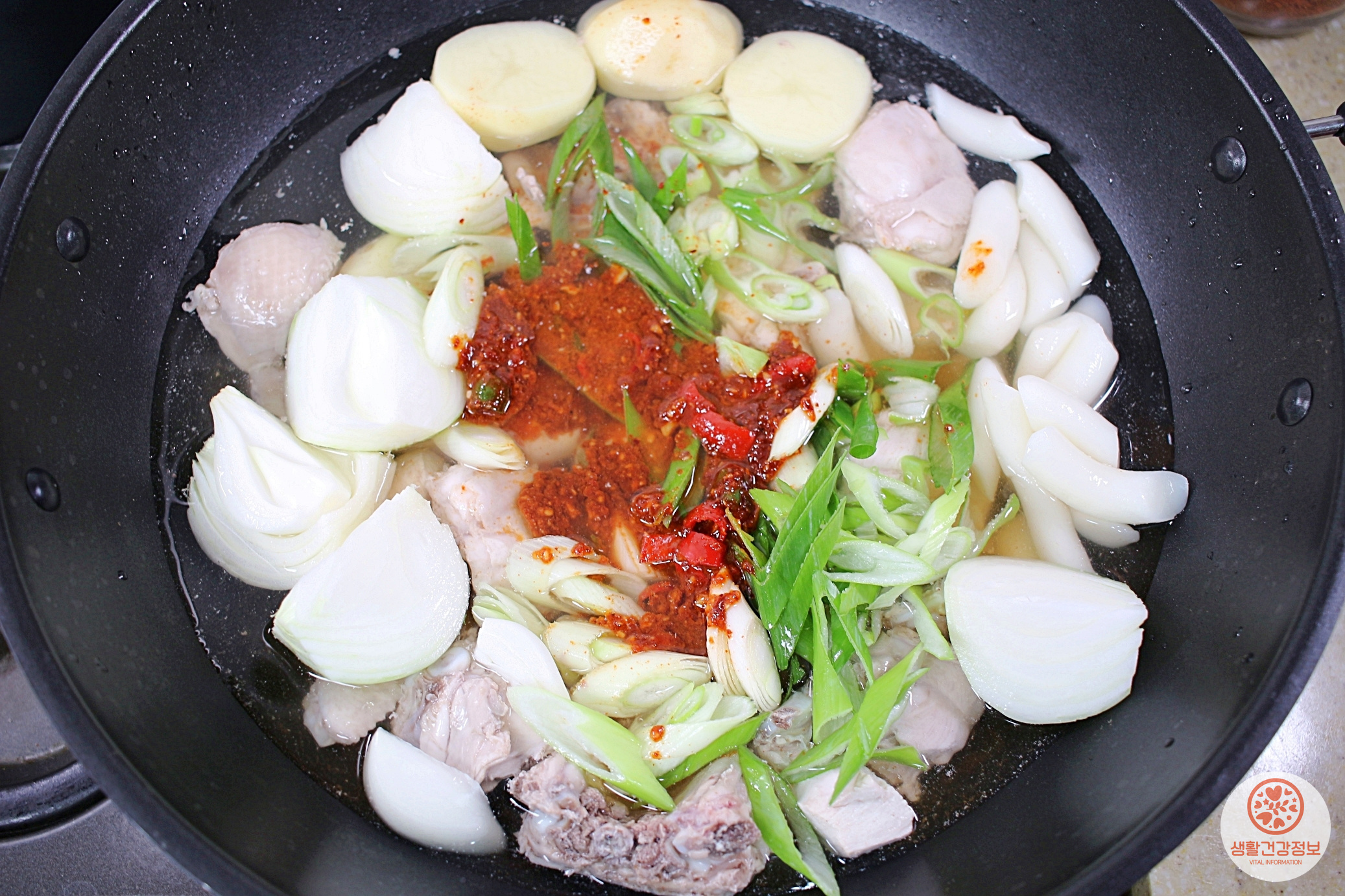 재료는 닭(1kg), 감자, 양파, 대파, 월계수잎, 청양고추, 떡.