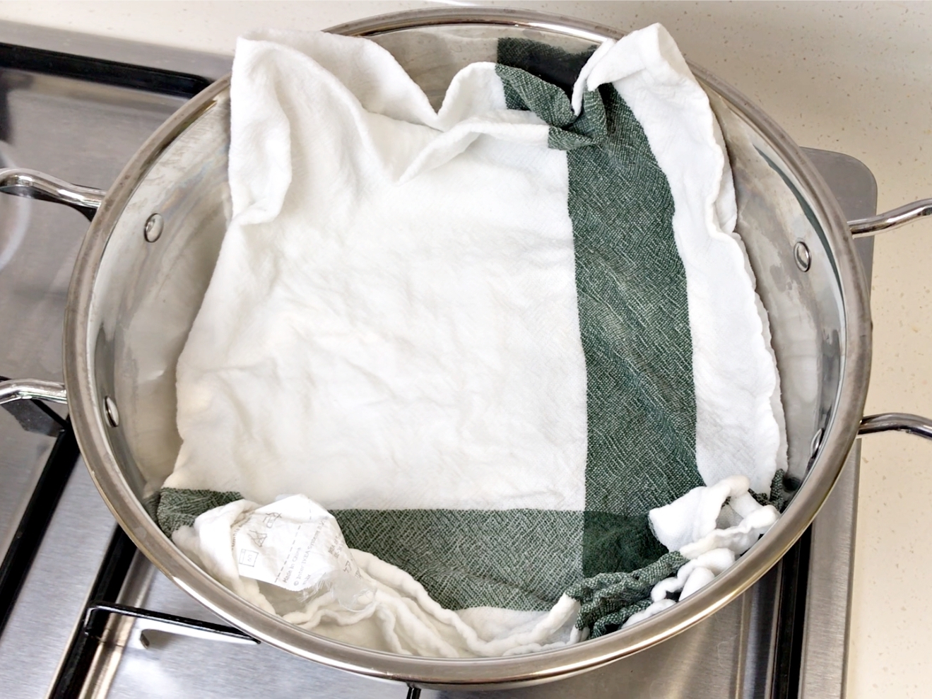 냄비 바닥에 깨끗하게 세탁한 행주를 접어서 깔아주세요.