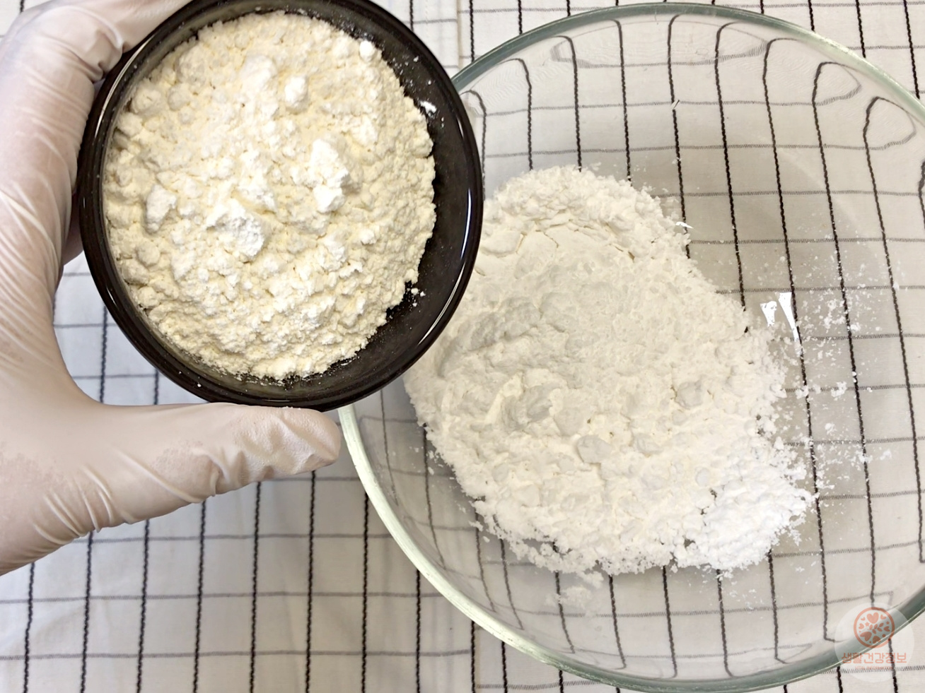 튀김반죽은 전분가루와 튀김가루를 1:1로 섞고