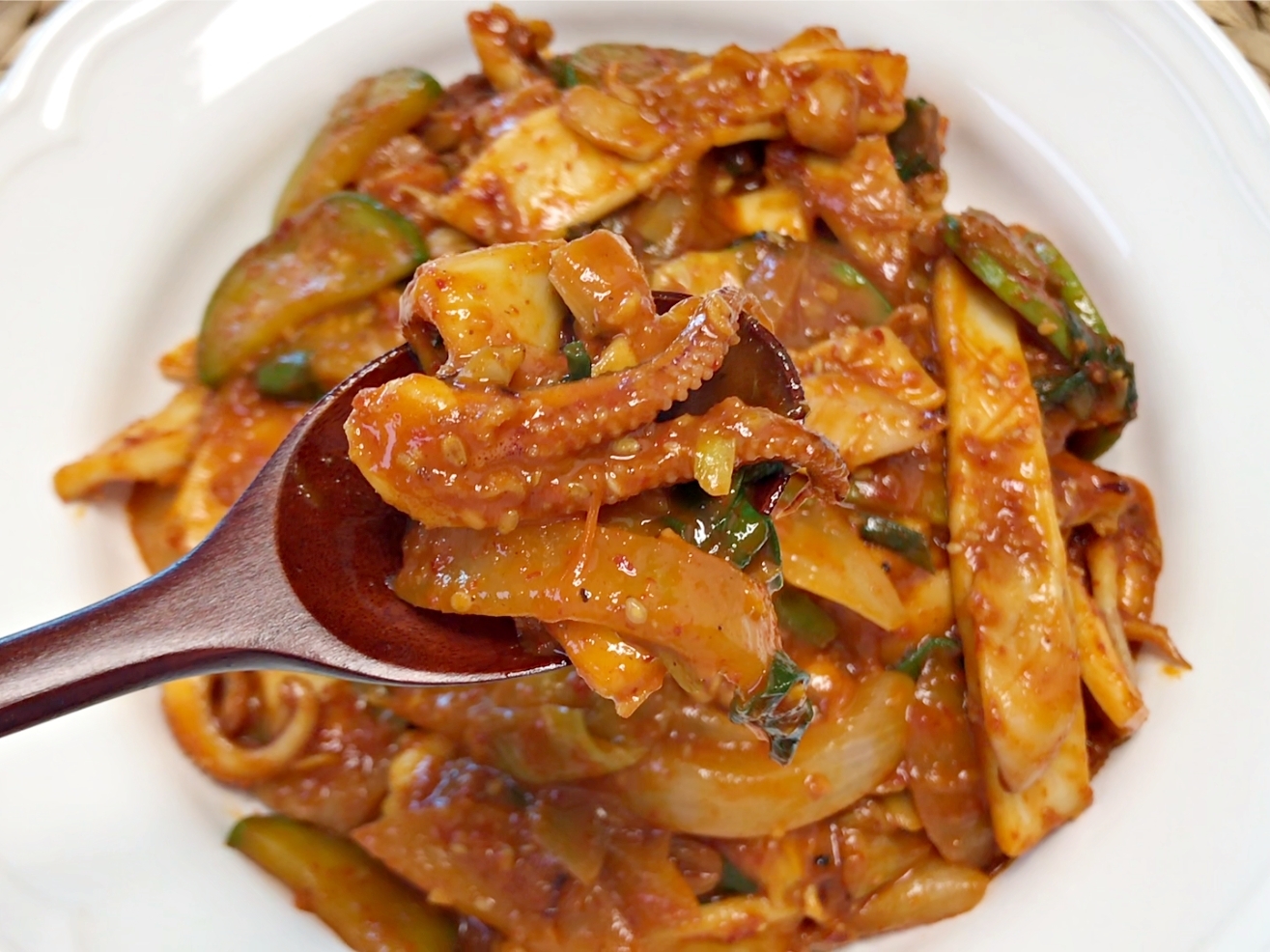 쫄깃한 오징어에 매콤달콤한 양념이 착 감기면