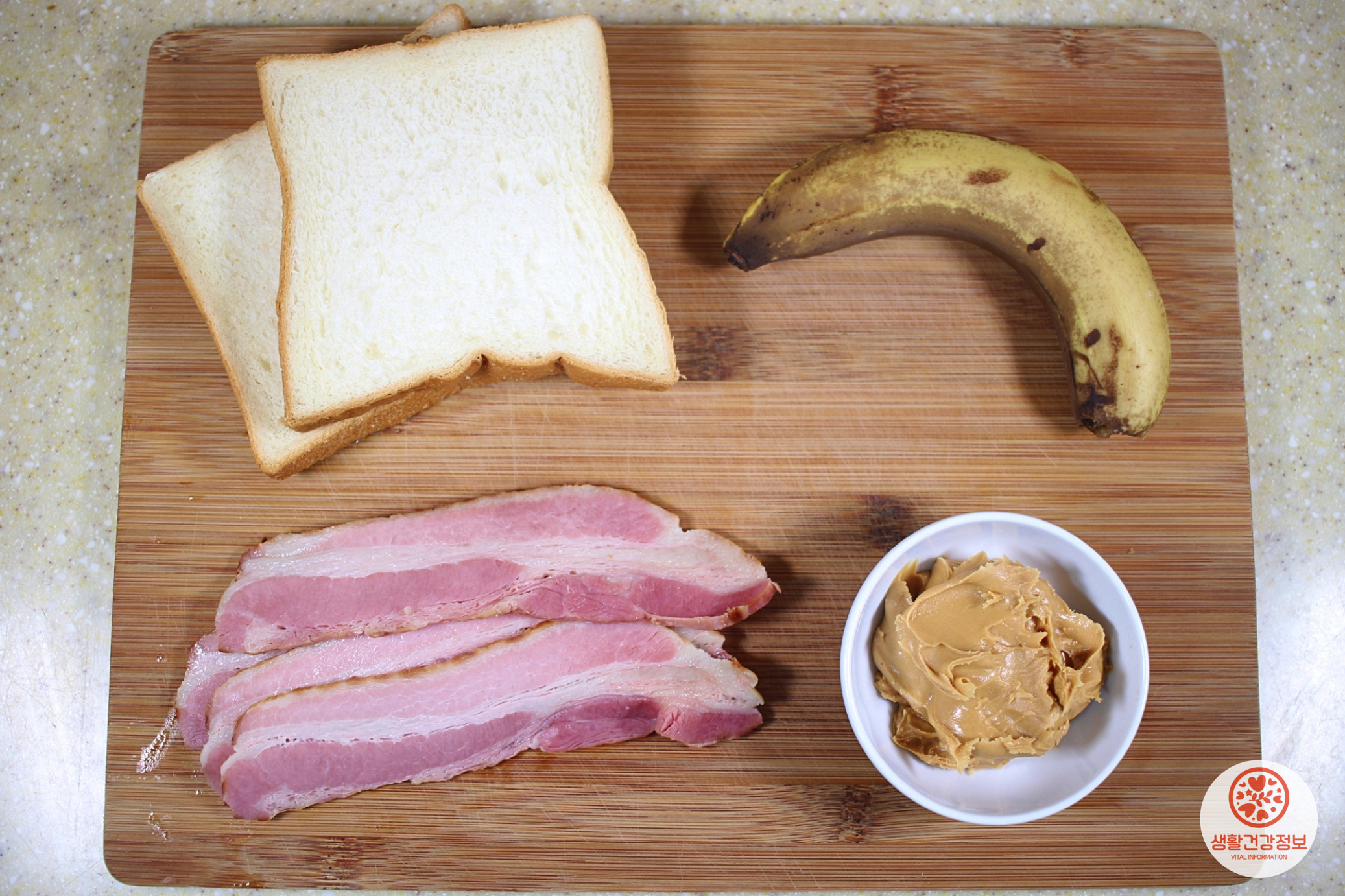 식빵, 땅콩버터, 바나나, 베이컨.