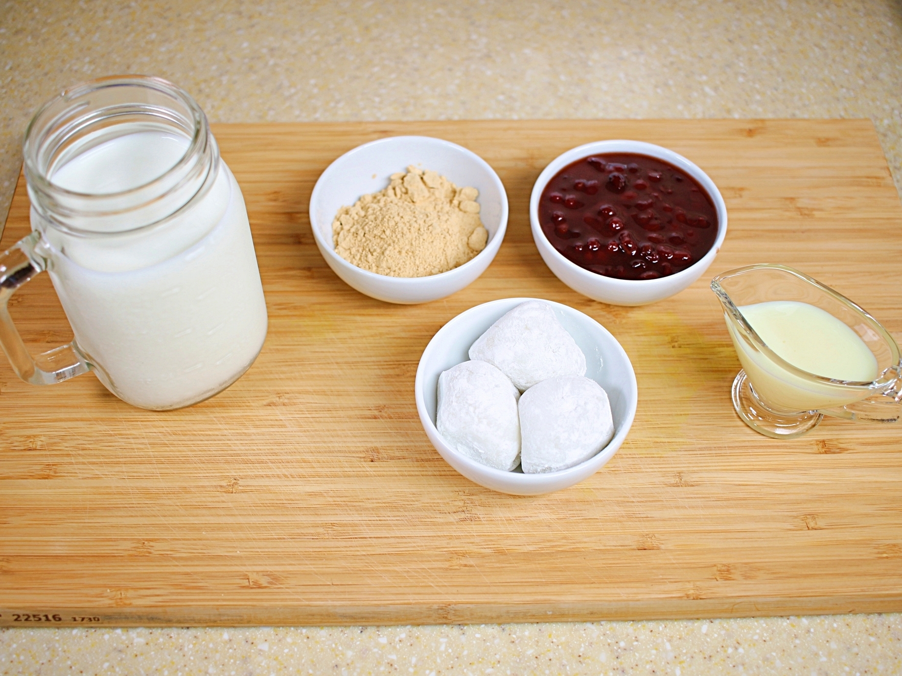 재료는 우유, 단팥, 콩가루, 찹쌀떡, 연유만 있으면 돼요.
