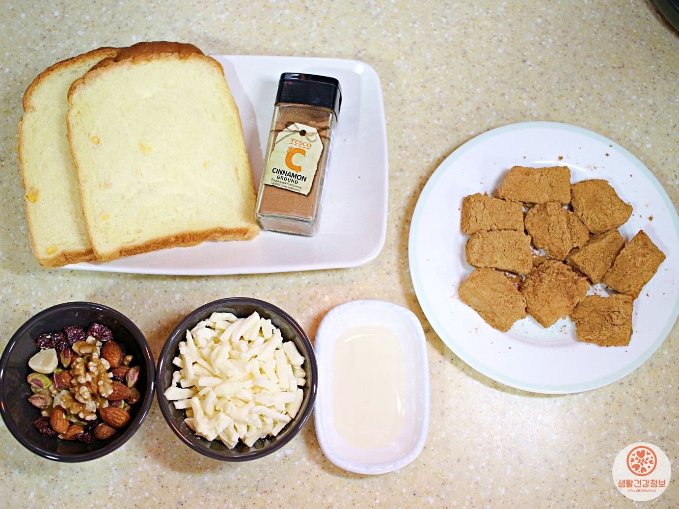 재료는 인절미, 식빵, 꿀, 견과류, 모짜렐라치즈.