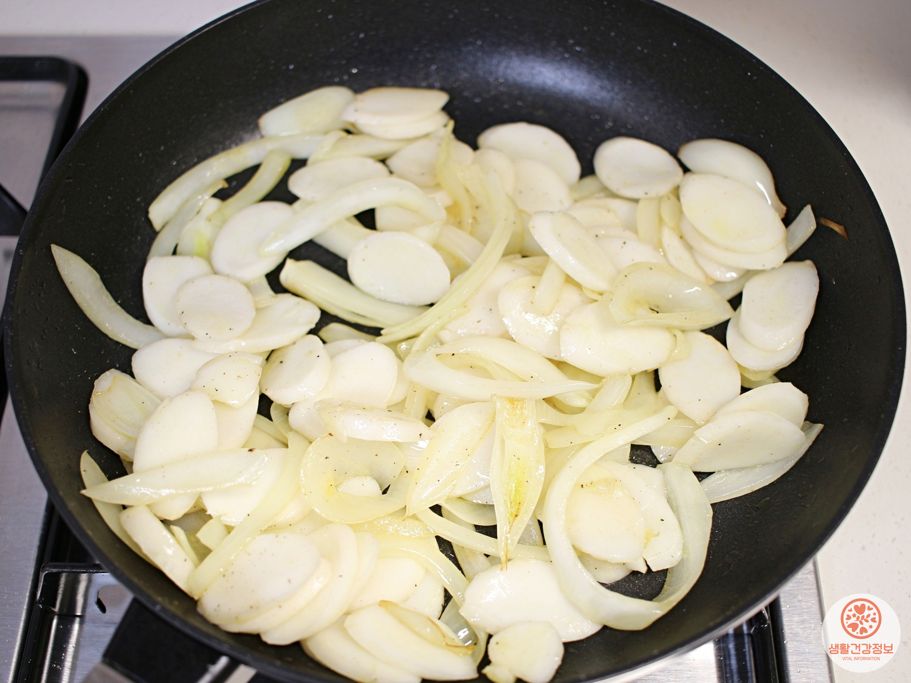 버터가 녹으면 양파를 넣어서 볶아주세요.