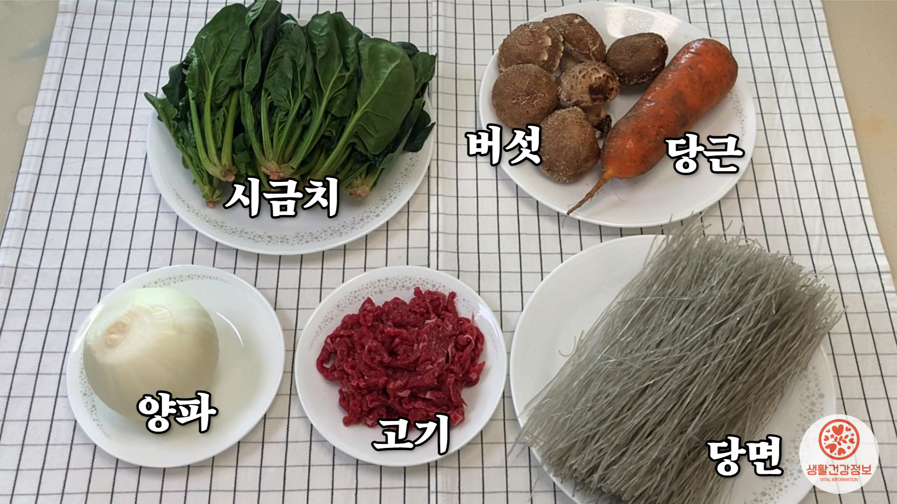 당면, 고기, 양파, 시금치, 버섯, 당근