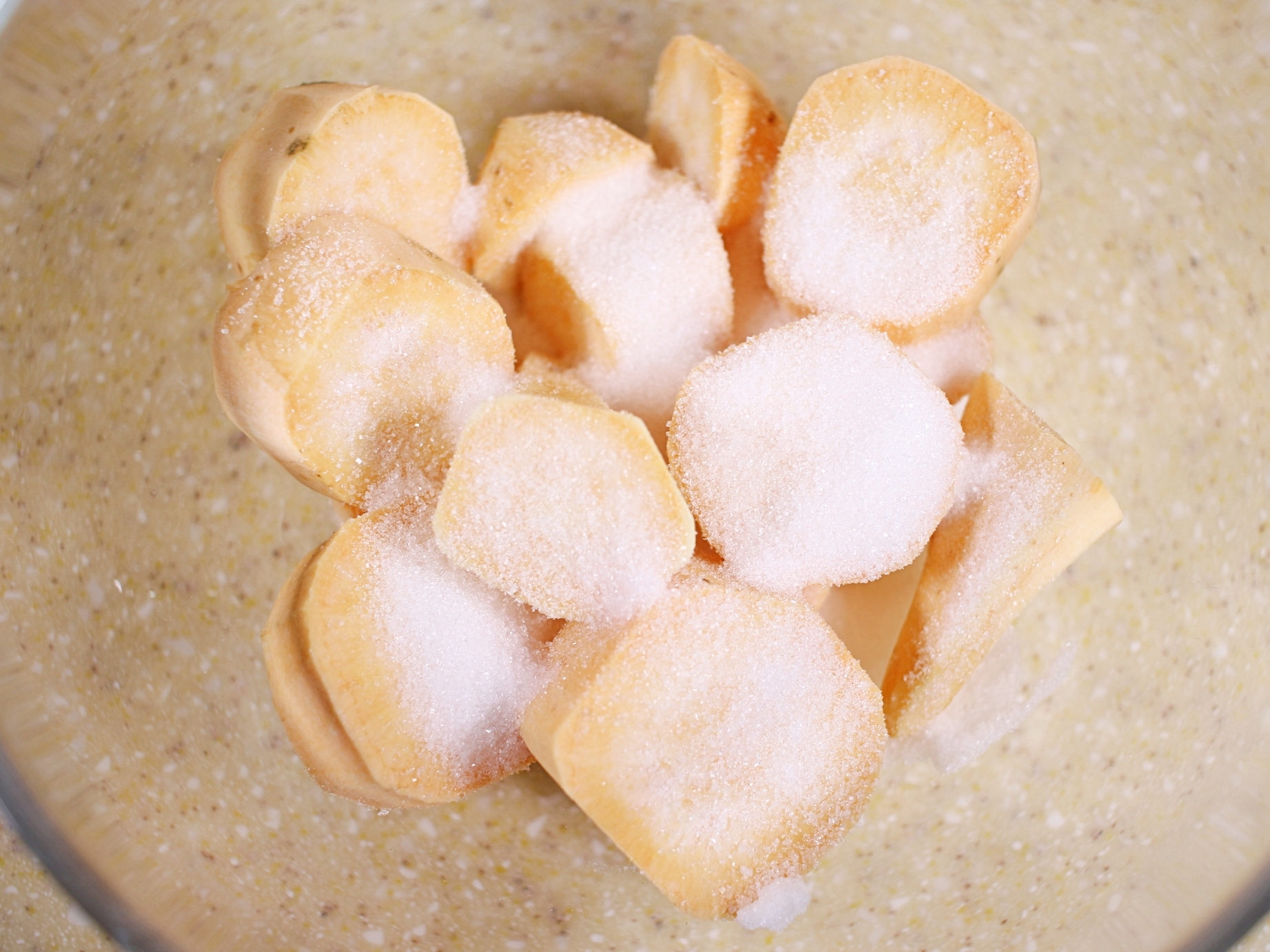 썰어둔 고구마를 볼에 담고 설탕을 솔솔 뿌려주세요.