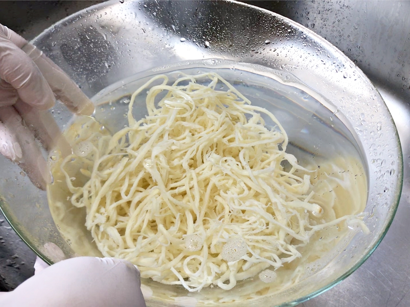 진미채는 물에 가볍게 헹군 뒤 물기를 털어주세요.