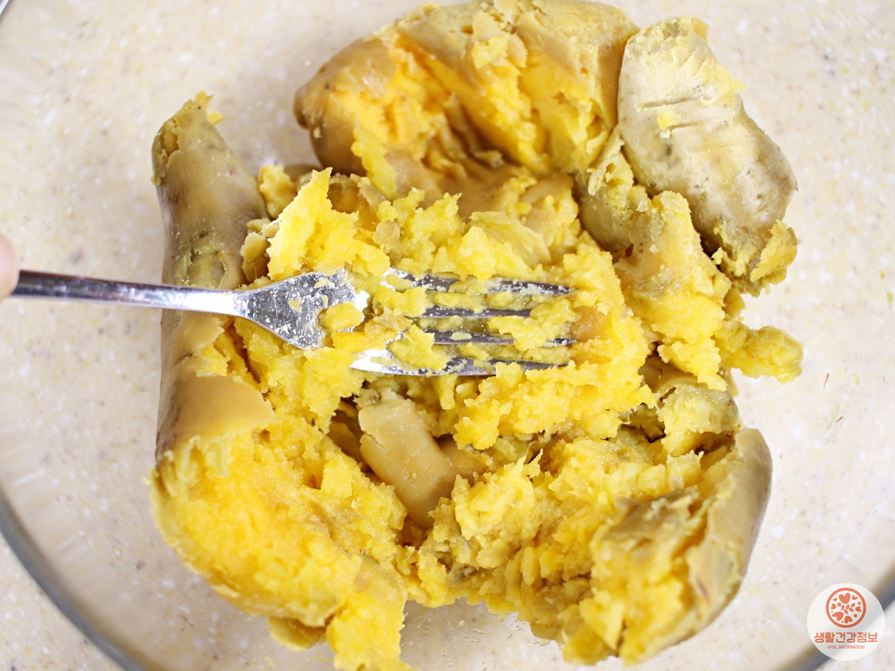 고구마를 삶아서 곱게 으깨주세요.