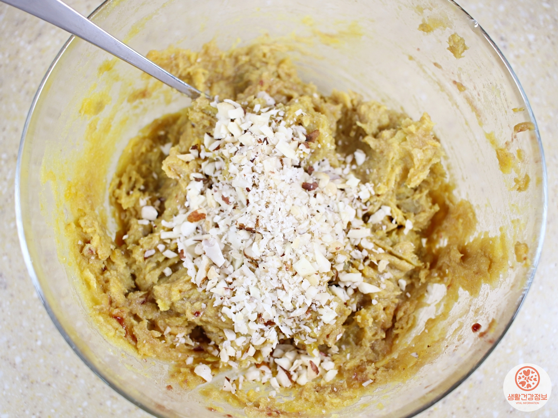 견과류 잘게 부숴서 넣고 골고루 섞으면