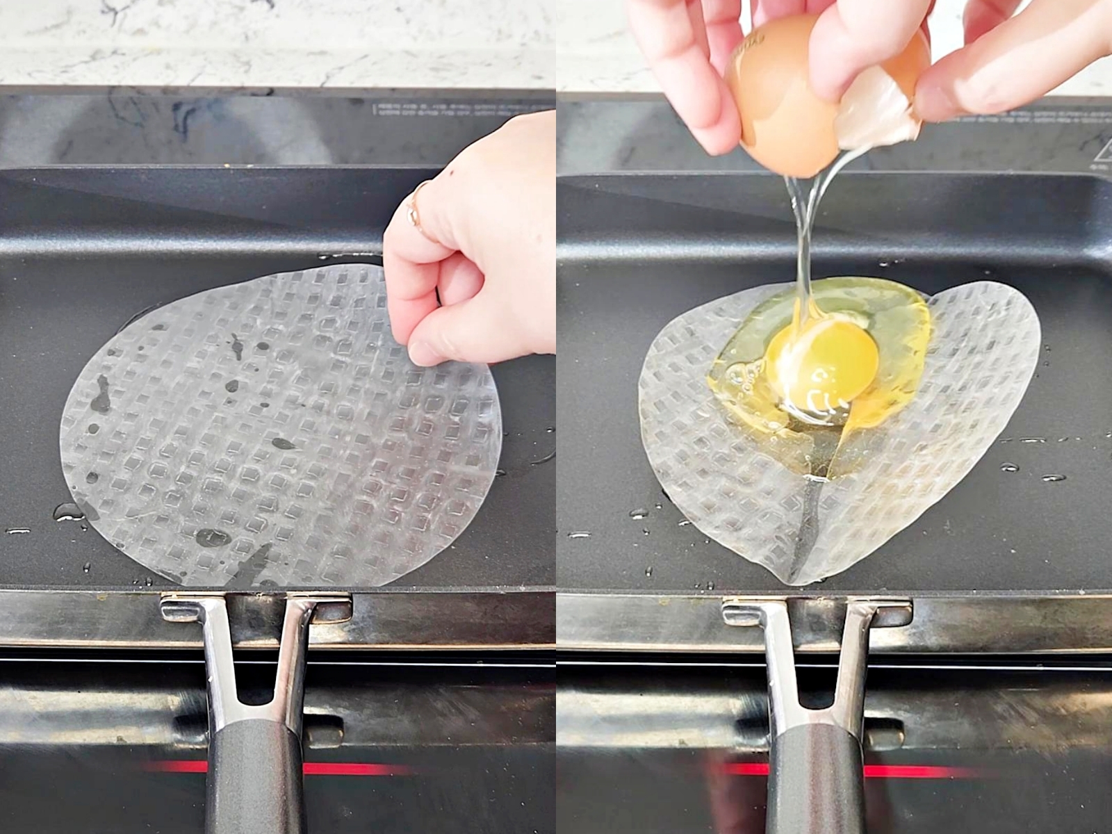 먼저 예열된 팬 위에 라이스페이퍼 한장을 올려주세요.