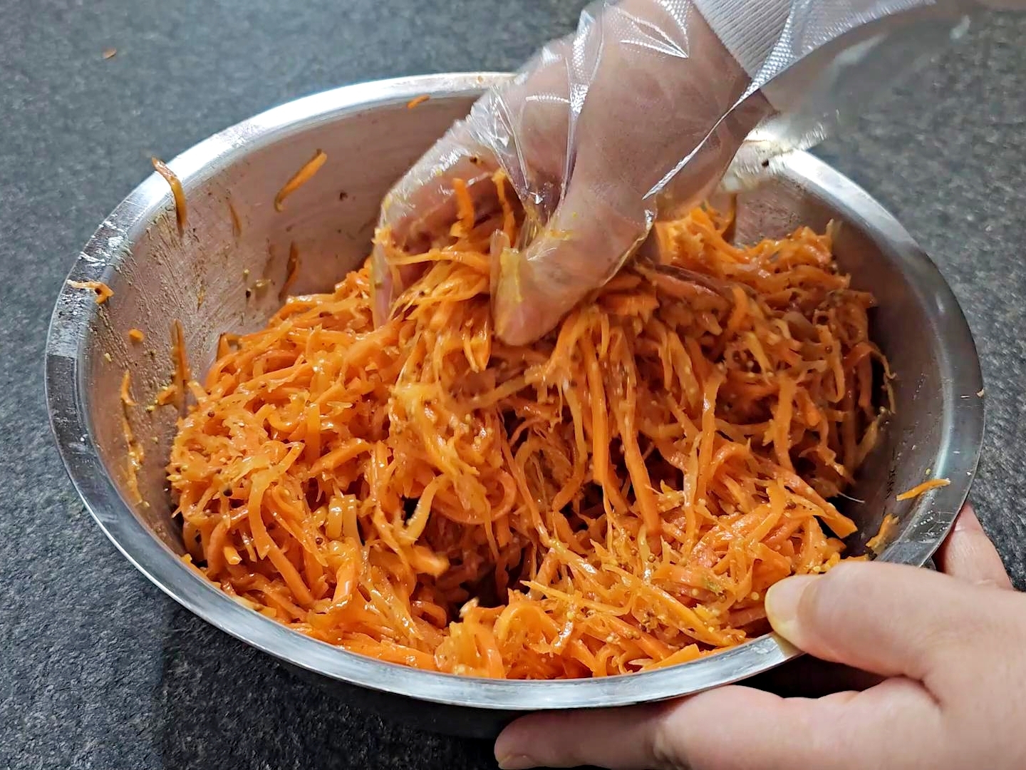 10분 정도 두면 당근의 수분이 빠져나오며 살짝 부드러워져요.
