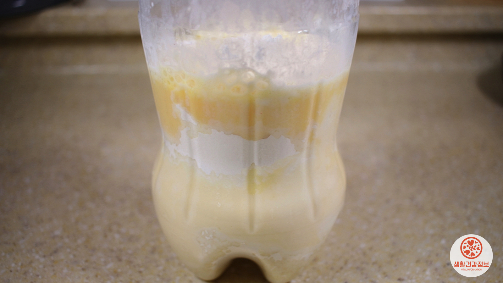 페트병에 팬케이크 재료를 차례로 넣었고요.