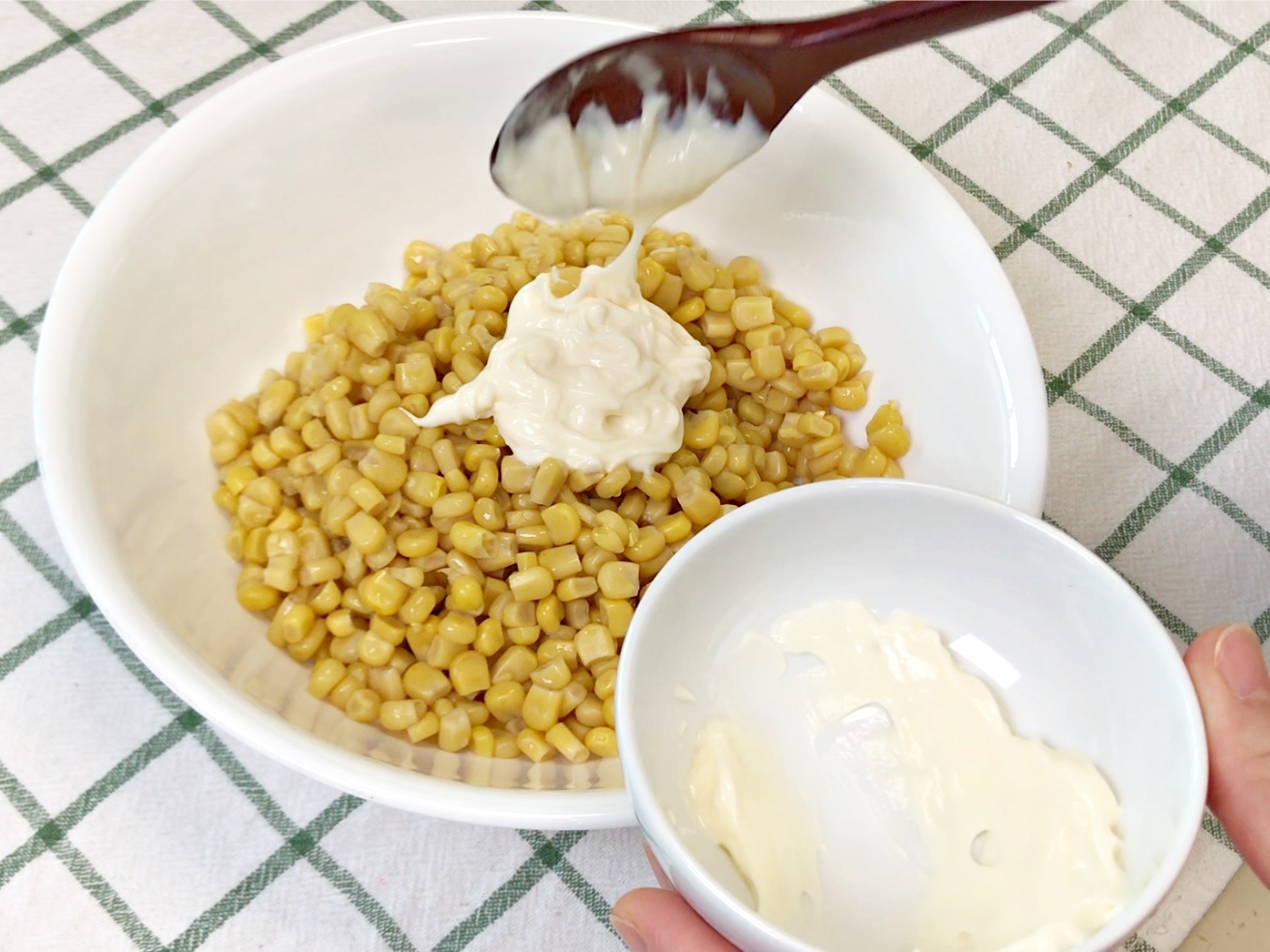 물기 빠진 옥수수에 마요네즈를 넣고 잘 섞어줘요.