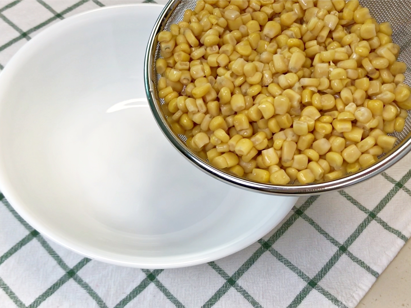 캔옥수수는 물에 헹군 뒤 체에 받쳐 물기를 빼 주세요.