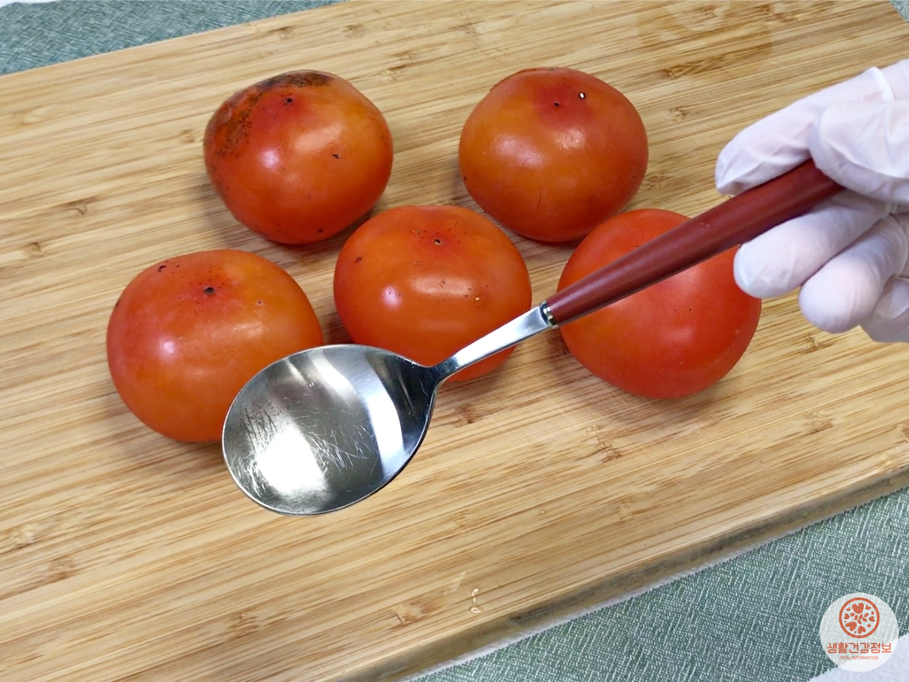 숟가락을 이용해서 홍시의 꼭지를 제거해주세요.